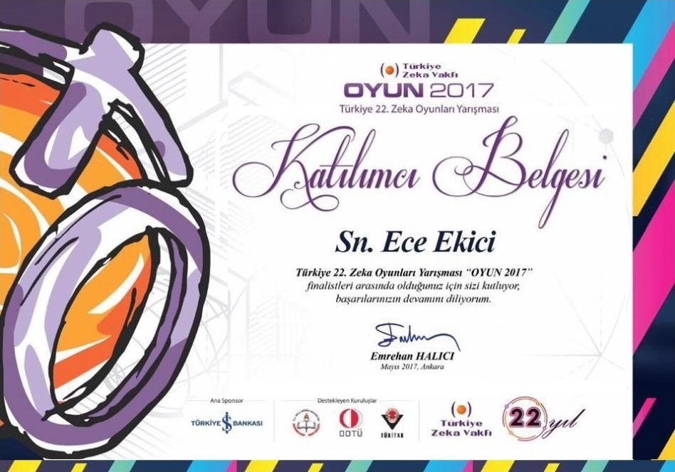 07.06.2018 Türkiye Zeka Oyunları Yarışması'nda bu yıl da finalist oldum.