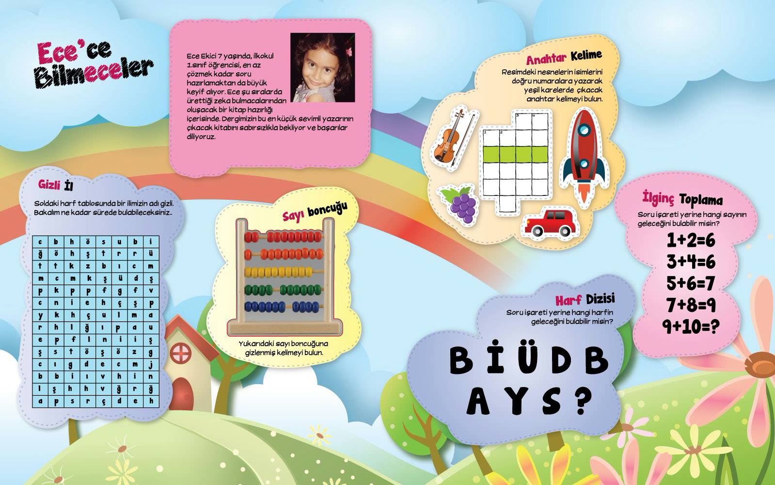 (Aylık yayımlanan bu dergide 2 yıl boyunca bana ayrılan ve adını “ECE'ce BilmECEler” koyduğum sayfaya soru ve bulmaca hazırladım.)